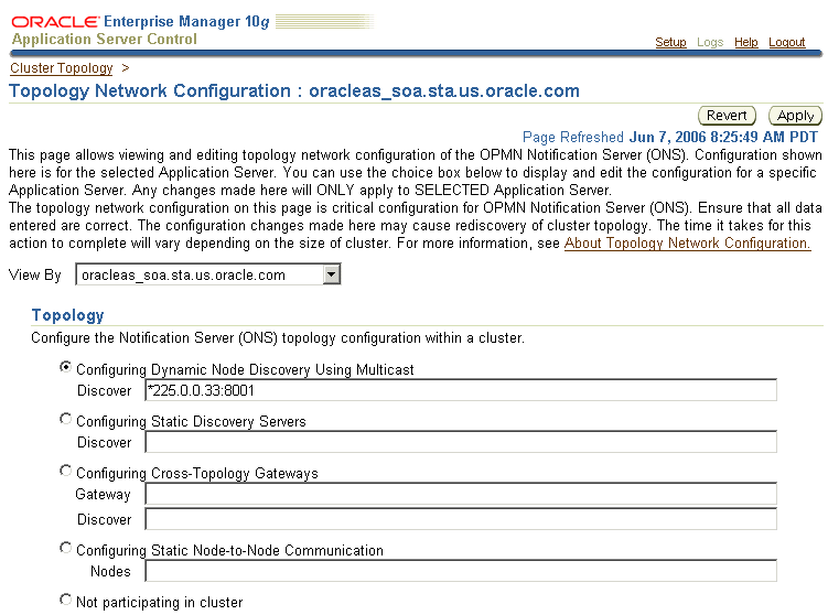 opmnctl config topologyコマンドを使用して、OPMNマルチキャスト検出アドレスを設定します(Application Server Controlコンソールはこのインスタンス上で実行されていないため使用できず、opmnassociateはデフォルトのOC4Jインスタンスにhome以外の名前を使用しているため使用できません)。 たとえば、UNIX上のWebサーバー・インスタンスをマルチキャスト・アドレス225.0.0.33に関連付けるには、次のコマンドを使用します。