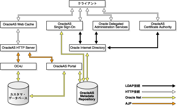 図10-2に、Oracle Application Serverコンポーネントと、これらのコンポーネントが使用するプロトコル間の一般的な通信パスを示します。たとえば、ブラウザはHTTPを使用してOracle Web Cacheと通信し、Oracle HTTP ServerはAJPを使用してOC4Jと通信します。これらすべてのプロトコルは、SSLに対応しています。