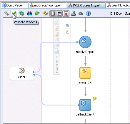 <sequence name="main"> <!-- Receive input from requestor. Note: This maps to operation defined in myCreditFlow.wsdl --> <receive name="receiveInput" partnerLink="client" portType="client:myCreditFlow" operation="initiate" variable="inputVariable" createInstance="yes"/> <!-- Asynchronous callback to the requester. Note: the callback location and correlation id is transparently handled using WS-addressing. --> <invoke name="callbackClient" partnerLink="client" portType="client:myCreditFlowCallback" operation="onResult" inputVariable="outputVariable"/> </sequence> </process>