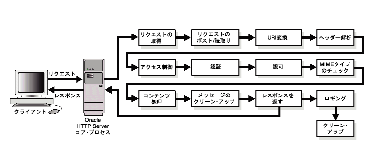 図7-1は、サーバーによるURLリクエストの処理方法を示したものです。このプロセスの各手順は、サーバー・モジュールによりサーバーの構成に応じて処理されます。たとえばBasic認証が使用される場合、図7-1の認証および認可という手順は、mod_auth