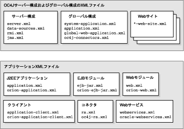 この付録では、OC4JサーバーとそこにデプロイされるJ2EEアプリケーションおよびモジュールの構成データを格納するために使用されるXMLファイルについて詳しく説明します。
