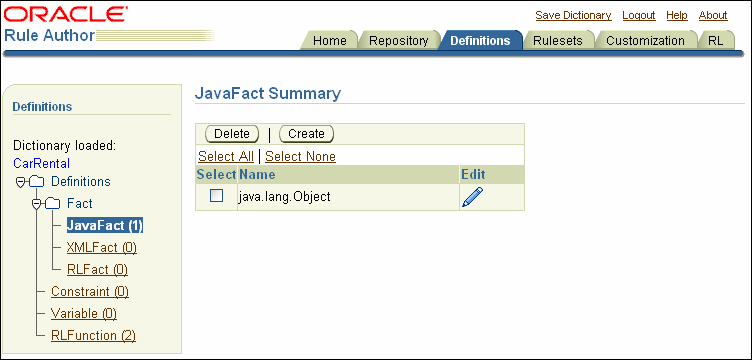 import java.util.Date; import oracle.rules.sdk.ruleset.RuleSet; import oracle.rules.sdk.repository.RuleRepository; import oracle.rules.sdk.repository.RepositoryManager; import oracle.rules.sdk.repository.RepositoryType; import oracle.rules.sdk.repository.RepositoryContext; import oracle.rules.sdk.dictionary.RuleDictionary; import oracle.rules.sdk.exception.RepositoryException; import oracle.rules.sdk.store.jar.Keys; import oracle.rules.rl.RuleSession; import carrental.Driver;