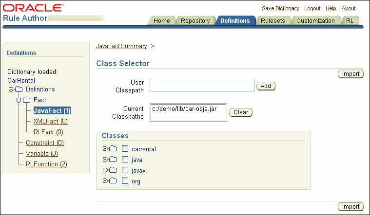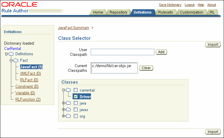 Javaファクトをデータ・モデルにインポートする前に、Rule Authorで使用可能なJavaファクトが組み込まれているクラスおよびパッケージを作成する必要があります。そのためには、Rule Authorを使用して、Javaクラスが格納されているクラスパスを指定します。たとえば、DriverというJavaクラスのクラスパスを追加する手順は、次のとおりです。