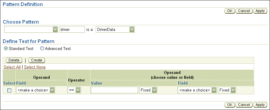 driverと入力(パターンのバインド変数名を定義)します。この値を使用して、単一のルールで同じタイプの複数のインスタンスをテストできます。たとえば、パターンのバインド変数を使用すると、driver1.age > driver2.ageなどの比較で、指定した名前を使用して、ある運転者と他の運転者との一致を比較できます。
