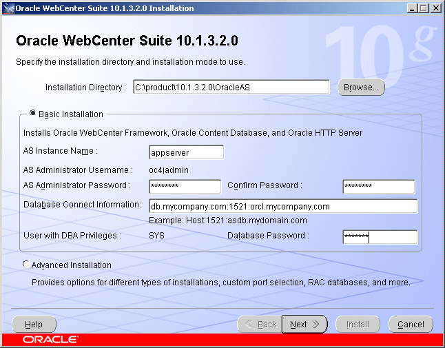 インストール・ディレクトリ: Oracle Application Serverをインストールするディレクトリを入力します。