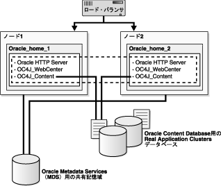 Oracle WebCenter FrameworkおよびOracle Content DBを実行するノードでは、次の2つのタイプのインストールを各ノードで実行する必要があります。