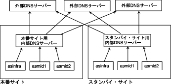 方法2: 本番サイトとスタンバイ・サイトに異なる内部DNSサーバーを設定します。この構成によって、各サイト(本番またはスタンバイ)のノードがサイト内でホスト名を解決できるようになります。内部DNSサーバーの上には、企業、つまり外部のDNSサーバーがあります。内部DNSサーバーは、信頼できないリクエストは外部DNSサーバーへ転送します。外部DNSサーバーは、内部DNSサーバーの存在を知りません。詳細は、図6-6を参照してください。