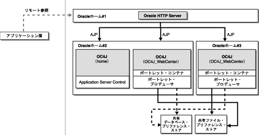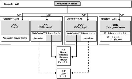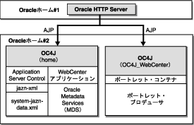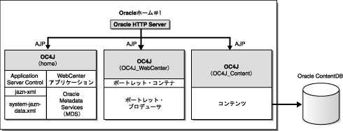 1つの中間層で、Oracle WebCenter Framework、Oracle HTTP ServerおよびOC4Jを、単一のOracleホーム内に保持。 |