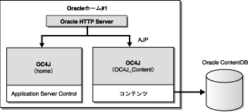 1つの中間層で、Oracle WebCenter Framework、Oracle Content DB、Oracle HTTP ServerおよびOC4Jを、単一のOracleホーム内に保持。 |