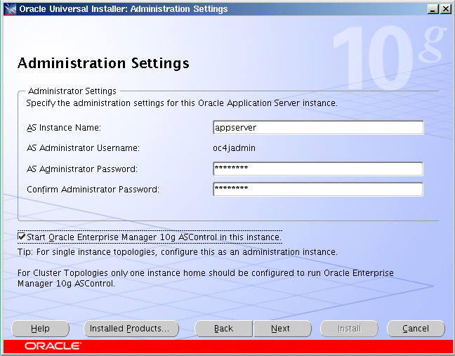 Oracle Application Serverインスタンス名と 「このインスタンスでOracle Enterprise Manager 10g ASControlを起動」を選択して、このインスタンスでApplication Server Controlを実行します。トポロジに1つのみのインスタンスをインストールする場合は、必ずこれを選択してください。 詳細は、5.3.4項「「管理(Administration)設定」画面」を参照してください。 |