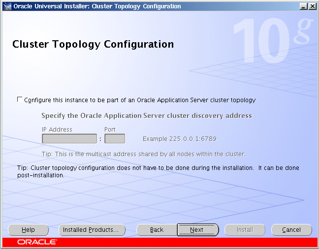 このインスタンスをOracle Application Serverクラスタ・トポロジの一部として構成するかどうかを選択します。 「このインスタンスをOracle Application Serverクラスタ・トポロジの一部として構成」を選択した場合は、「IPアドレス」および「ポート」を指定します。 詳細は、5.3.10項「「クラスタ・トポロジ構成」画面: 「Oracle Content Database」インストール・タイプ」を参照してください。 |