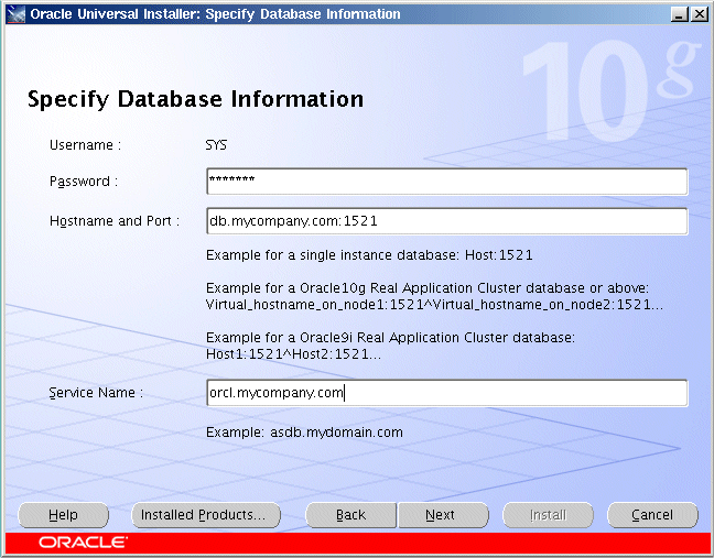 サービス名: データベースのサービス名を入力します。サービス名には、データベース・ドメイン名を含める必要があることに注意してください。たとえば、 詳細は、5.3.5項「「データベース情報の指定」画面」を参照してください。 |