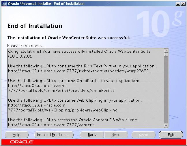 この画面には、Oracle Application Serverのインストールが成功したかどうかが示され、インストールした製品に関する重要な情報が表示されます。たとえば、特定のWebアプリケーションのURLに関する情報が示されます。いつでも確認できるように、この情報を書き留めておいてください。