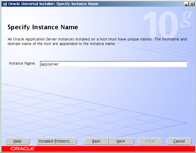 Oracle Application Serverインスタンス名を指定します。指定したインスタンス名によって、このOracle Application Serverインスタンスが一意に識別されます。