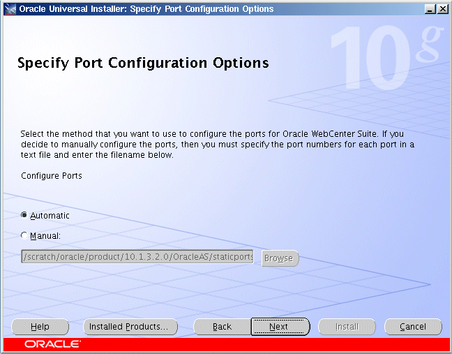 ポート番号をカスタマイズする場合は、「手動」を選択します。各コンポーネントに使用するポート番号が含まれている既存のポート構成ファイルへのフルパスおよびファイル名を指定する必要があります。通常、このポート構成ファイルの名前はstaticports.iniですが、ファイルの形式が適切であれば、任意の名前を指定できます。製品に付属するstaticports.iniファイルの詳細は、2.6.3項「カスタムのポート番号の使用(「静的ポート」機能)」を参照してください。