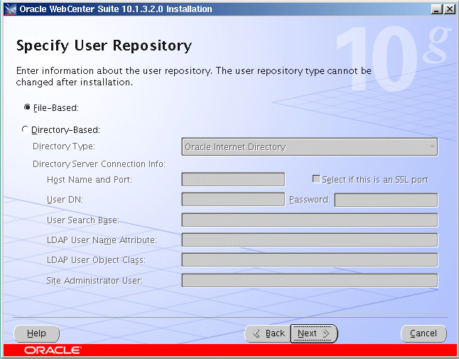 「ファイルベース」または「ディレクトリベース」リポジトリ・タイプのいずれかを選択します。 詳細は、5.3.7項「「ユーザー・リポジトリの指定」画面」を参照してください。 |