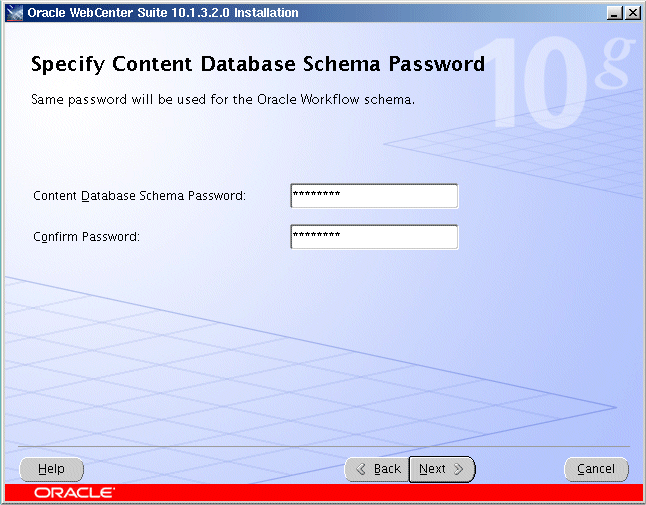 Oracle Content DB中間層を初めてインストールする場合は、Oracle Content DBスキーマに使用するパスワードを入力します。Oracle Content DBスキーマの名前はCONTENTです。このスキーマは、インストール時に作成されます。Oracle Workflowスキーマにも同じパスワードが使用されます。