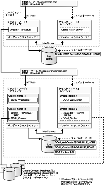 Oracle WebCenter FrameworkおよびOracle Content DBを実行するハードウェア・クラスタへのインストールを実行する場合は、次の2つのタイプのインストールを実行する必要があります。