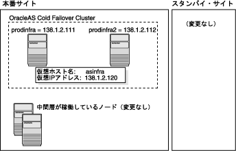 OracleAS Cold Failover Cluster環境の本番サイトにOracleAS Infrastructureを設定し、この環境を少し変更できます。詳細は、6.5.2.4項「本番サイトでOracleAS Cold Failover Clusterを使用する場合(OracleAS 10.1.2.n.nのみ)」を参照してください。