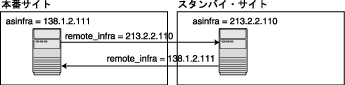 スタンバイ・サイトでは、asinfra.ashaには引き続き物理IPアドレスを使用しますが、remote_infra.ashaには仮想IPアドレスを使用します。