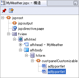 アプリケーション・ナビゲータで、「MyWeather.jspx」を右クリックし、「ページ定義に移動」を選択します。ページ定義がまだ存在していない場合は、「はい」をクリックします。