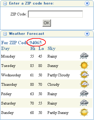 Omniportletでは、ZIPコードが94065であるカリフォルニア州レッドウッド市の気象予報が表示されます。このデータを提供するWebサービスは、有効なUI ZIPコードが渡されれば、他の地域の気象情報を返すこともできます。次の手順では、この2つのポートレットをリンクし、最初のポートレット(Parameter Formポートレット)にOmniPortletのコンテンツを制御させる方法を学びます。