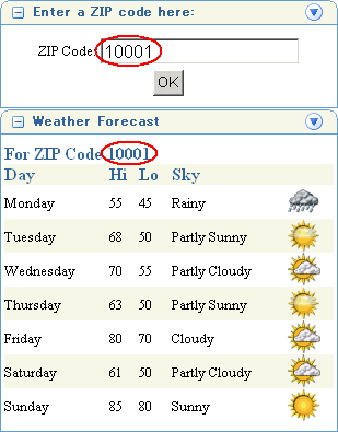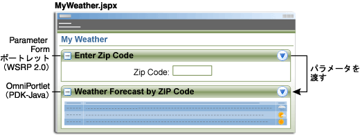 ora_wsrp_navigparam_Parameter1: このパラメータを介して、Parameter FormポートレットがZIPコードを受け入れるように設定しました(「手順3: Parameter Formポートレットのカスタマイズ」)。