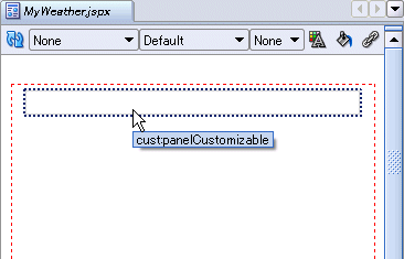 「cust:panelCustomizable」コンポーネントの上にドラッグ・アンド・ドロップします。ビジュアル・エディタは、図6-9のように表示されます。
