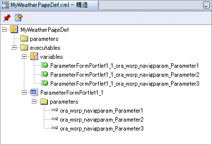 構造ウィンドウ(図6-10)には、Parameter Formの各ポートレット・パラメータに対して1つずつエントリが表示されます(ora_wsrp_navigparam_Parameter1、ora_wsrp_navigparam_Parameter2およびora_wsrp_navigparam_Parameter3)。また、3つのページ変数エントリと、それに対応する名前および接頭辞<portletname_n_>も表示されます(この場合はParameterFormPortlet1_1_)。