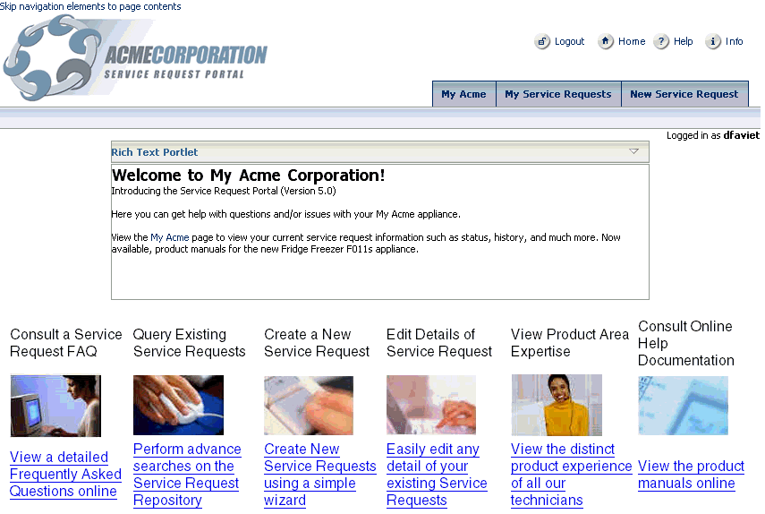 また、顧客が参照できない他のコンポーネントにアクセスできます。「My Acme」ページの「Product Information」サブタブの新規コンポーネント(JSR 168ポートレット)を使用すると、特定の洗濯機や乾燥機などの製品の詳細を表示できます。