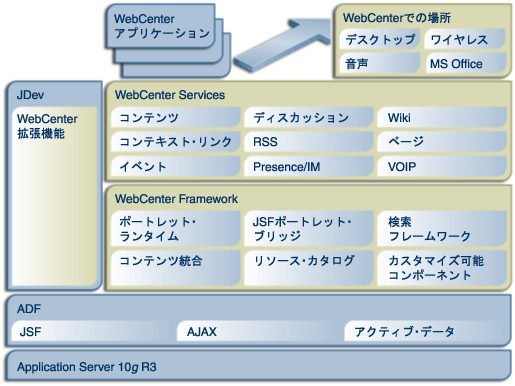 図に示されているコンポーネントの中には、Oracle WebCenter Suiteの初期のリリースでは使用できないものがあります(Presence/IM、ディスカッションおよびWiki)。この章では、Oracle WebCenter Frameworkのこのリリースに関連するコンポーネントについて説明します。