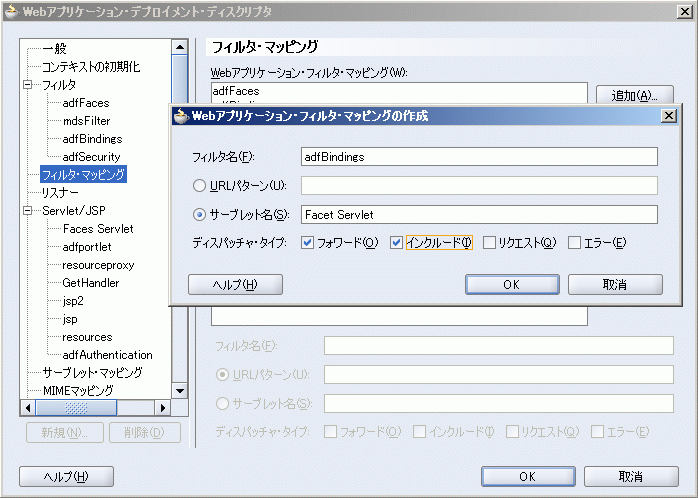 必ず、「サーブレット名」にFaces Servletと入力し、「フォワード」および「インクルード」の各ディスパッチャ・タイプを選択します。