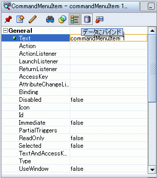 commandMenuItemについて、プロパティ・インスペクタで「Text」プロパティを選択し、「データにバインド」アイコンをクリックして式をTextプロパティに追加します(図5-8を参照)。「データにバインド」ダイアログ・ボックスが表示されます。