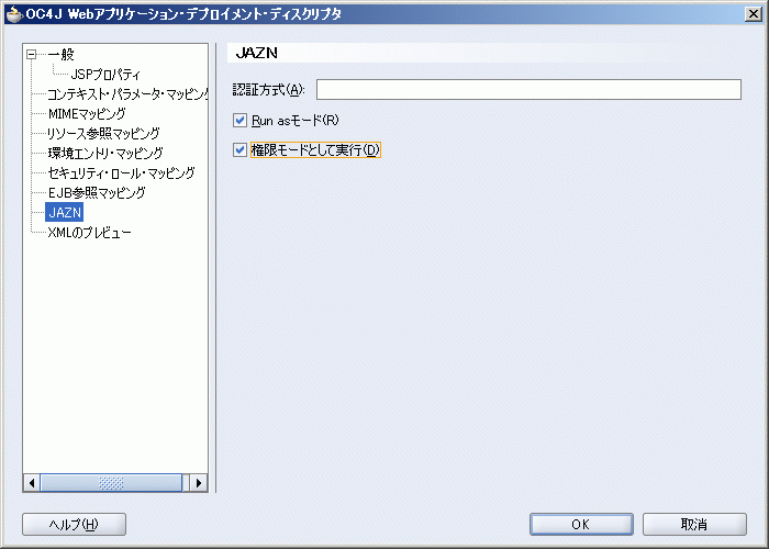 「Webコンテンツ」→「WEB-INF」フォルダの「orion-web.xml」ファイルを右クリックし、「プロパティ」を選択します。「OC4J Webアプリケーション・デプロイメント・ディスクリプタ」ダイアログ・ボックスが表示されます。