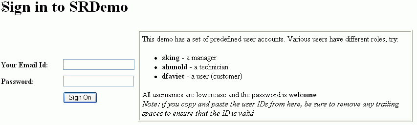 すべてのJSPおよびJSPXファイルに対する標準的なJ2EEセキュリティ制約のため、デフォルトのSRDemoログイン・ページに自動的にリダイレクトされます。このログイン・ページは、静的HTMLを含む単純なJSPページです。ahunold、skingおよびdfavietの3種類のユーザーとしてログインできます(図5-3を参照)。