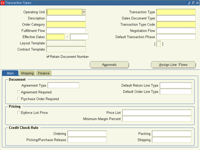 The Transaction Type determines the header level process used at the header level on an order. The combination of transaction type, line type, and item type determines the line workflow. Please note that the Operating Unit field on the Transaction Types window is a mandatory field and transaction types are assigned to one or more operating units.