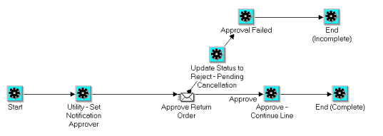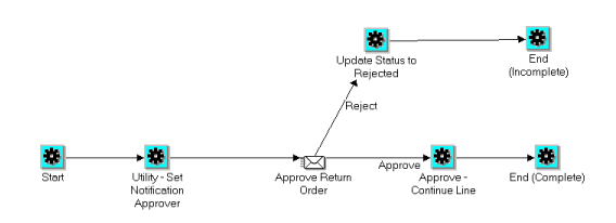 The Utility - Set Notification Approver activity determines to whom notification is sent. Once this is determined, the process sends the Approve Return Order notification. If the return is authorized, then the notification returns a pass result and process is approved at the Approve - Continue Line activity. The process then ends with a complete result and returns to the order flow.