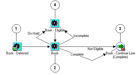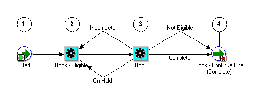 At the Book activity in node 2 is a seeded lookup activity that can complete with a result of Incomplete, On Hold, Not Eligible, or Complete. A Complete or Not Eligible result leads to the Book - Continue Line (Complete) activity in node 3. An On Hold or Incomplete result leads to Book - Eligible activity in node 4. After the eligibility is determined, the process moves back to the Book activity in node 2. This process can only end after the order is booked.