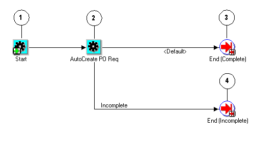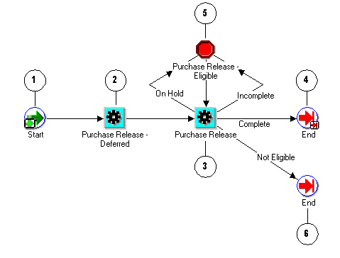 When you display the Process window for the Book - Order, Deferred process, you see that the process consists of 4 unique activities, which comprise the 4 activity nodes that appear in the workflow diagram. The following diagram depicts the Book - Order, Deferred subprocess. Each node of this subprocess is numbered for referencing.