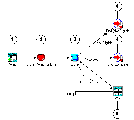 If the Close activity returns an On Hold or Incomplete result, the process moves to another Wait activity at node 6. If the Close activity returns not eligible result, the process moves to the End (Incomplete) activity at node 5.