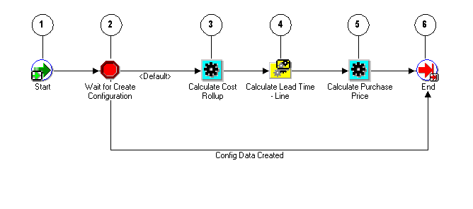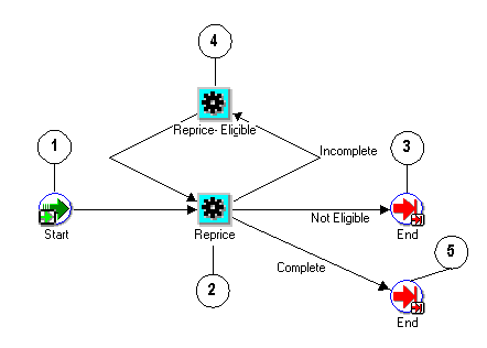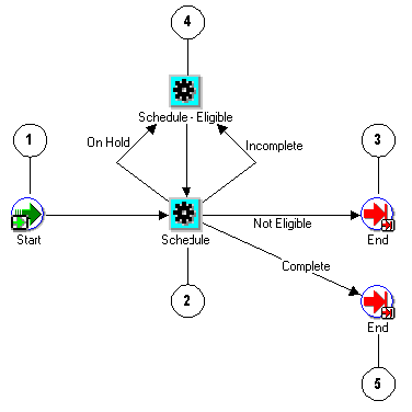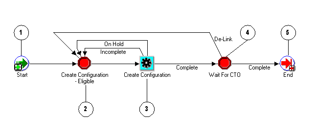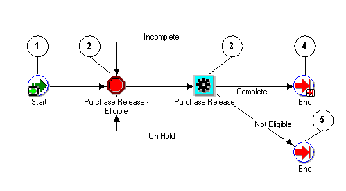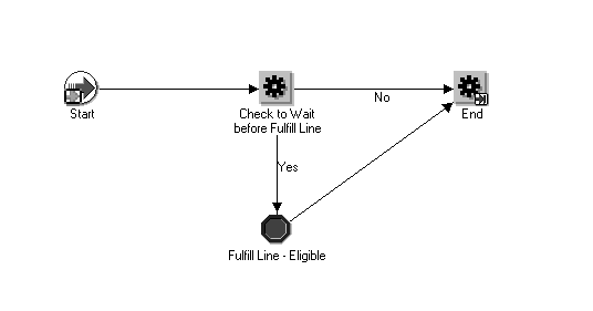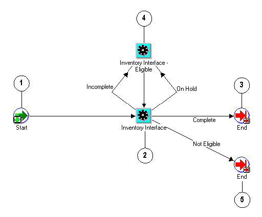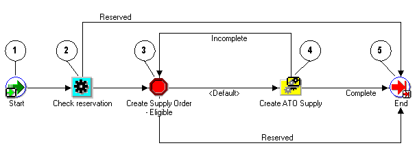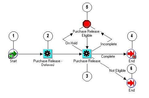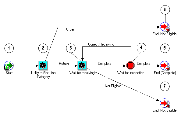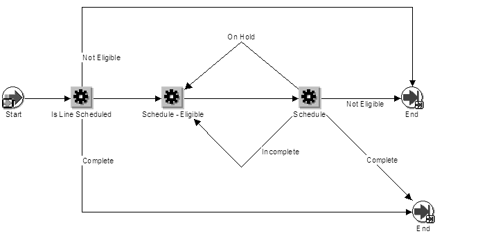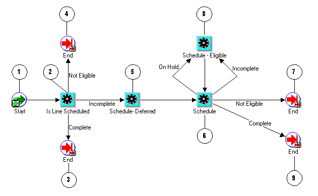 At the Book - Eligible activity in node 2, the process waits for you to manually verify that the order is eligible for booking. When eligibility is determined, the process proceeds to the Book activity at node 3. After booking is complete, the processes ends and returns to its parent line flow.