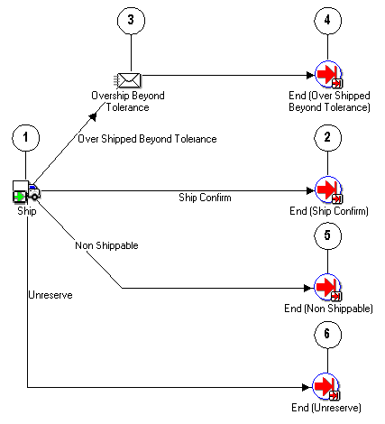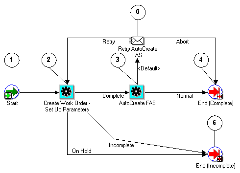 When you display the Process window for the Close - Order process, you see that the process consists of 6 unique activities, which comprise the 6 activity nodes that appear in the workflow diagram. The following diagram depicts the Close - Order subprocess. Each node of this subprocess is numbered for referencing.