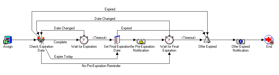 The Process window displays the activities and subprocesses of the Offer Expiration - Negotiation process, which comprise the nodes that appear in the workflow diagram. The following diagram depicts the Offer Expiration - Negotiation process.