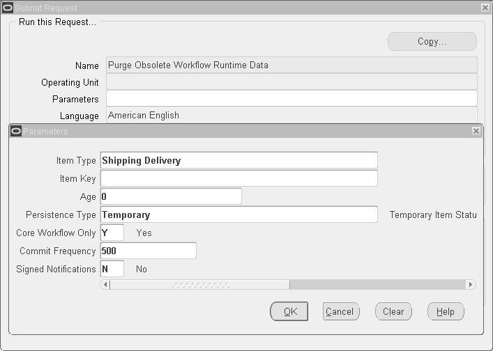 You can use the Purge Obsolete Workflow Runtime Data concurrent program to purge workflow data. For purging shipping data, you can use parameters such as Item Type, Item Key, Age and Persistence Type. In addition, if you use shipping purge and purge a given delivery or trip – the workflows for the delivery will be purged automatically.