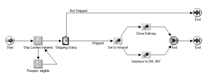 The Ship to Deliver Initiated subprocess enables you to branch into either the Delivery Flow – Generic process or Ship to Deliver subprocess. It is started once a delivery line is assigned to a delivery. The ship to deliver subprocess is started upon ship confirmation if it takes the enabled route. It is contained in the seeded data file wshwftrx.wft and is associated with the Shipping Delivery item type.