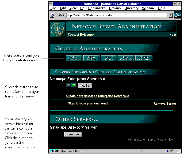"Other Servers" appears only if your computer contains both 2.x and 3.x versions of the administration servers. This might occur, for example, if you install Netscape Directory Server 1.02, which uses the 2.x administration server, and Netscape Enterprise Server 3.0, which uses the 3.x administration server.