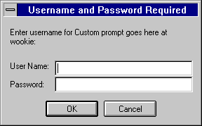 Prompt for authentication lets you specify message text that appears in the authentication window. You can use this text to describe what the user needs to enter. Depending on the operating system the user has, they will see about the first 40 characters of the prompt. Netscape Navigator and Netscape Communicator cache the username and password and associate them with the prompt text. This means that if the user accesses areas of the server that have the same prompt, they won't have to retype their usernames and passwords. Conversely, if you want to force users to reauthenticate for various areas, you simply need to change the prompt for the ACL on that resource.