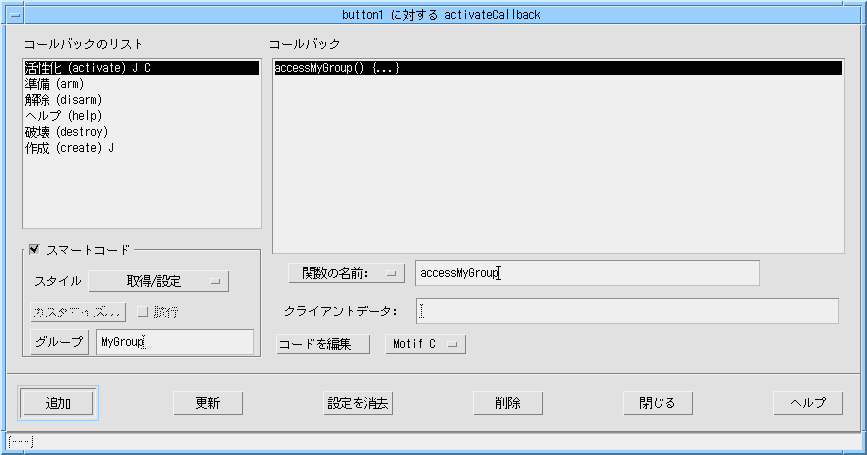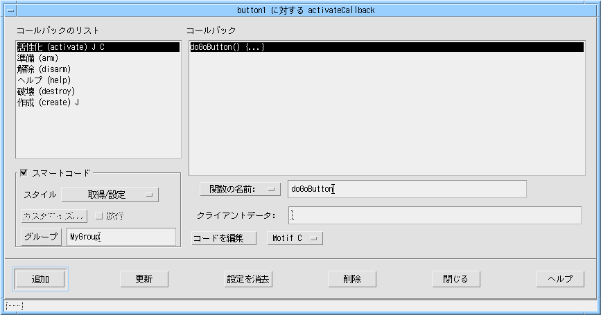 デフォルトでは、従来の Motif、MFC、または Java のコールバックが生成されます。スマートコードを生成するには、「コールバック」ダイアログで「スマー トコード」トグルを選択してください。
