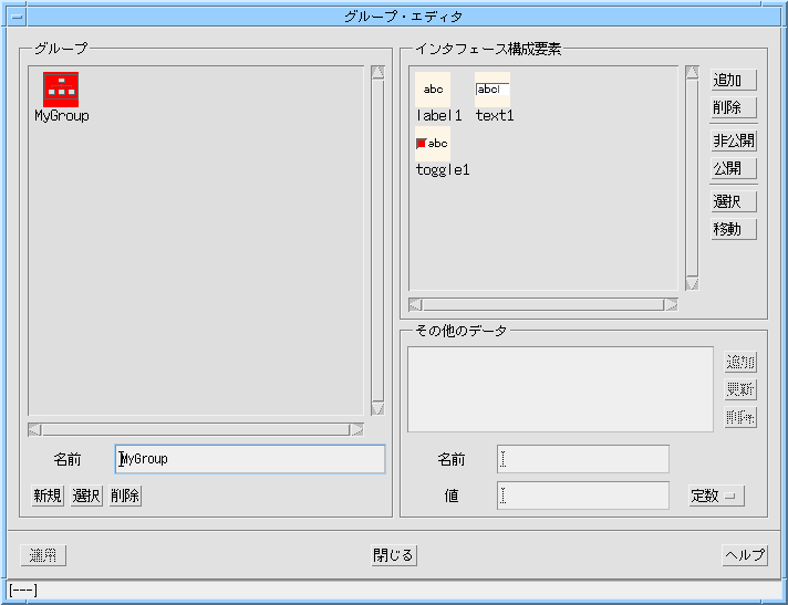 エディタが消えて、グループボタンの横にあるテキストフィールドに名前「MyGrou p」が追加されます。名前を直接テキストフィールドに入力することもできます。