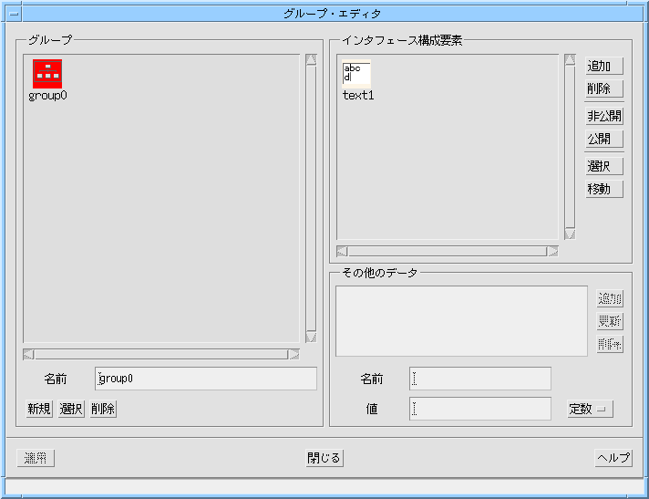 4. 表示されたグループエディタで、図 18-4 に示すようにテキストウィジェットだけをグループのメンバーとして持つ Group0 というグループがあることを確認します。
